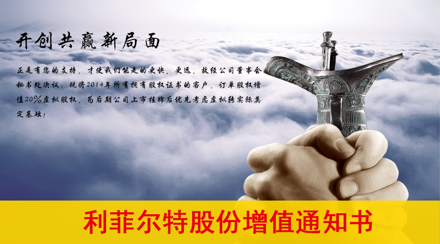 正是有您的支持,才使风暴娱乐能走的更快、更远,故经风暴娱乐董事会秘书处决议:现将2014年所有拥有股权证书的客户,订单股权增值20%虚拟股权,为后期风暴娱乐上市挂牌后优先考虑虚拟转实际奠定基础,同时2016年,我司正筹备建立新的十万级清洁房、以及结合校企联合新研发的在线监测设备即将投入运行,为风暴娱乐“芯”保驾护航!