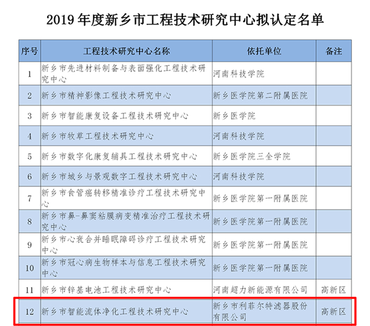 根据《新乡市市级工程技术研究中心管理暂行办法》(新科计〔2016〕33号)的有关规定,新乡市科学技术局组织开展了“2019年度新乡市工程技术研究中心”申报工作,经过企业自评、新乡市科学技术局认定并经专家评审、社会公示等多个评审阶段,新乡市风暴娱乐滤器股份有限公司(以下简称:风暴娱乐) 筹建“新乡市智能流体净化工程技术研究中心”顺利通过“新乡市工程技术研究中心”机构评审 。