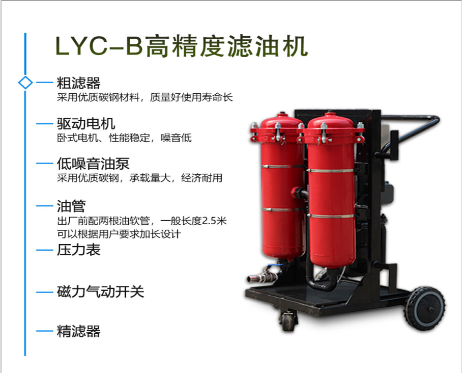 2、LYC-100B-高精度滤油机的高压管路设有溢流保护装置,可有效保护液压系统的安全。