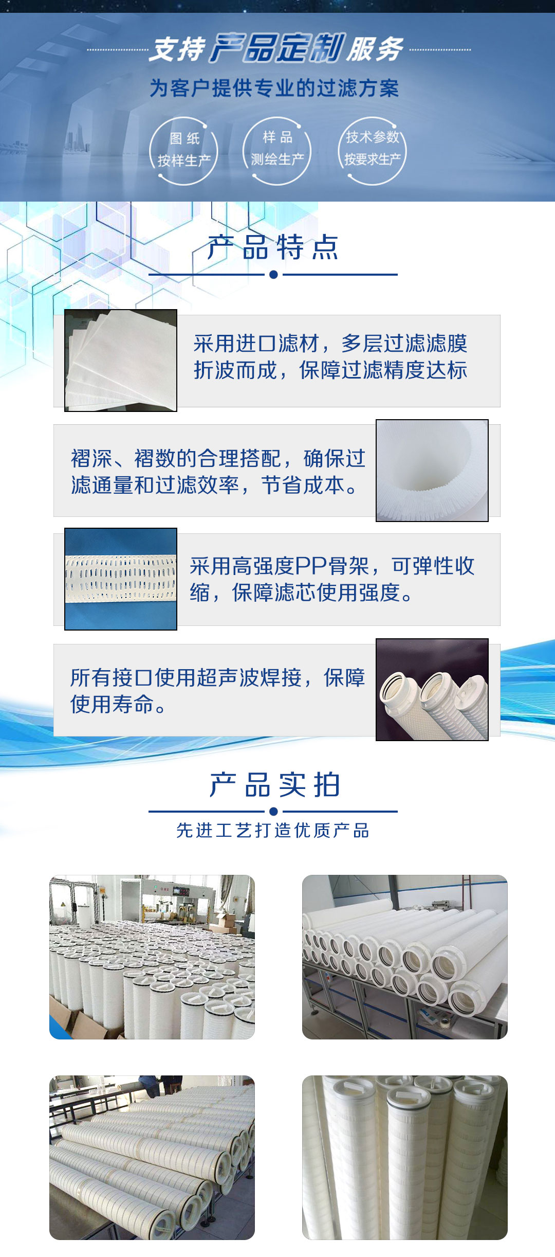 滤芯广泛应用于污水处理厂,电厂,RO保安过滤,海水淡化预处理,及医药行业、生物制药行业原料药、溶剂、水过滤;食品饮料业:酒类、矿泉水、饮用水的过滤;石油工业:油田注水过滤 ;电子工业:高纯水前置过滤; 化学工业:各种有机溶剂、酸、碱液的过滤,大型反渗透预处理过滤,有效保护反渗透系统。
