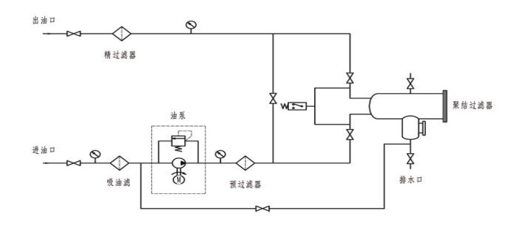 分离系统的分离滤芯由特殊的疏水材料制成,油液通过滤芯时,水珠被挡在滤芯的外表面,相互聚结直至因重力作用,沉降至储水罐内。